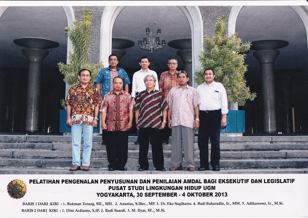Kepala Bagian Administrasi Hukum Pemerintah daerah kabupaten Kutai Kartanegara Mengikuti Pelatihan pengenalan penyusunan dan penilaian amdal bagi eksekutif dan legislatif pusat studi lingkungan hidup UGM yang di adakan di Yogyakarta pada tanggal 30 september sampai dengan 4 oktober 2013, sesuai dengan keputusan kepala pusat pendidikan dan pelatihan Kementrian Lingkungan Hidup Nomor: KEP-11/Pusdiklat/LH/11/2012 tentang Pedoman pelaksanaan pendidikan dan / atau pelatihan analisis mengenai dampak lingkungan.